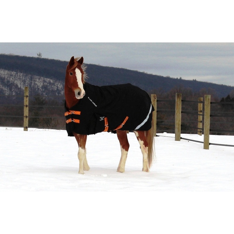 Our Outer Armor collection features a 1200D super tough and durable fabric. This 1200 Denier Turnout Blanket features a waterproof/breathable outer shell, high neck design, shoulder gussets, crisscross surcingle, an innovative snap closure at the chest, and 350 grams polyfill, plus a reflective hip stripe for added protection, your horse will be sure to stay warm and safe from the elements. 100% Polyester.
