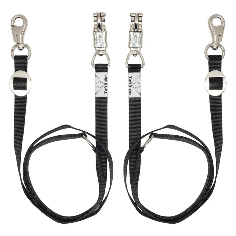 TuffRider Cross Ties are made from strong nylon webbing and feature a swivel trigger clip at one end for easy attachment and rotation. The other end has a panic clip for quick, secure release in emergencies. With an adjustable length and nickel-plated hard