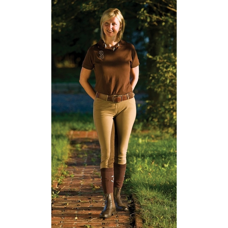 Contrast UltraGripp seat adds flair to this already fashionable full seat breech with low rise wide waistband. Stretch cotton microfiber fabric features high power and recovery for comfort and support, combining fashion and function.