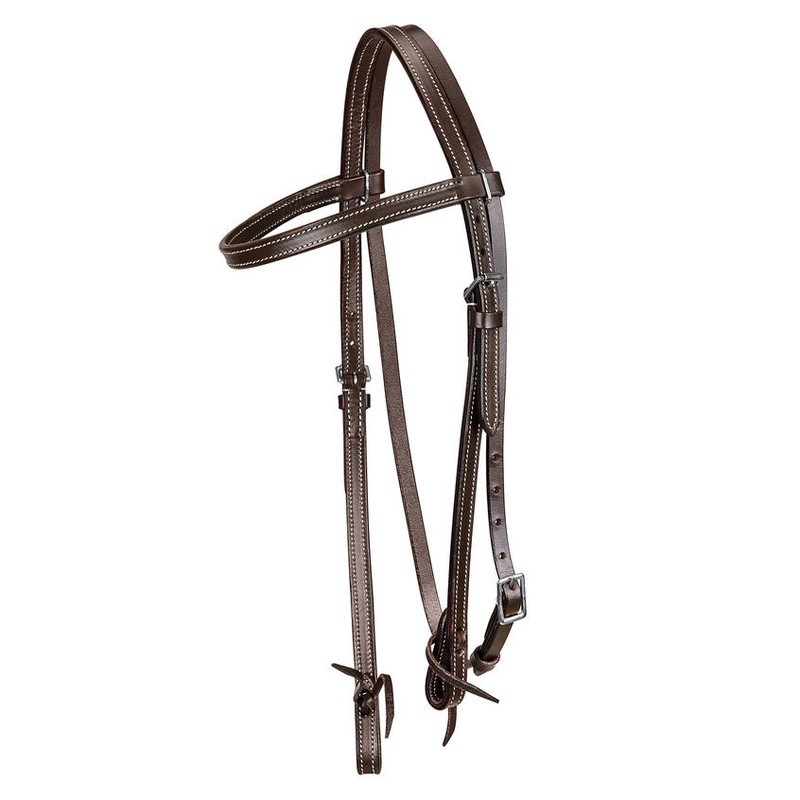 The Western Browband Headstall with Latigo Bit Ties by TuffRider is ideal for the working horse and rider at an affordable price! Crafted with quality, imported double-ply leather and metal hardware, this headstall is sure to last. Medium sized buckles make adjusting the cheek pieces easy and smooth. Latigo ties allow for quick and easy bit swapping and a traditional design. This conservative bridle comes in dark brown and contrast structural stitching for a simple look.