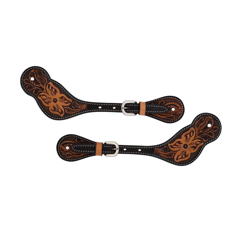 Light-oiled men's spur straps feature intricate floral tooling that looks great with a variety of bootsAntiqued finish highlights the toolingNon-rust stainless steel hardware for enduring qualityAdjustable design for a customized, secure fitMade from genui