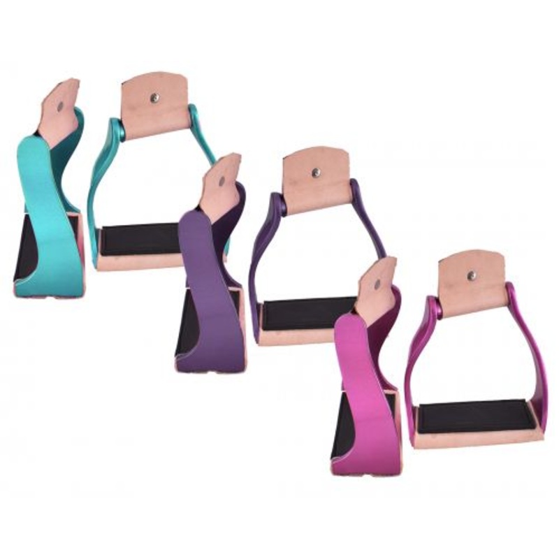 Lightweight color coated twisted angled aluminum stirrups. Bottom of stirrups are wrapped in light leather with a black rubber tread. These stirrups take the pain out of breaking in fenders. Neck is twisted to allow your feet to stay straight against the horse with out pressure on your ankle.