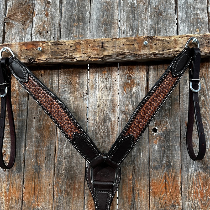 Breastcollar has two tones with a honeycomb tooling design.Full Horse size MeasurementsBreastcollar measurements - From Center Ring to D Ring -16"Breastcollar including toggles : shortest settings - 26" : Longest settings -29"Perfect for any barrel racing