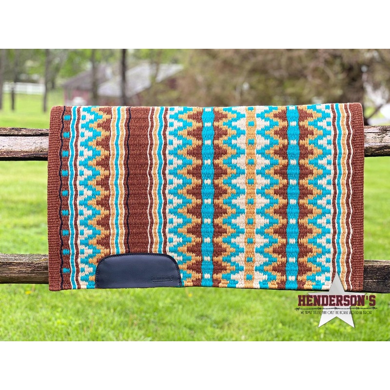 Western show pads by Henderson's. We have designed these pads to compliment your outfit in the show ring. All pads are made with 100% wool and are handwoven with wear leathers. All pad designs are copyright.Milk Chocolate base with Carmel, Sheepskin, Turqu