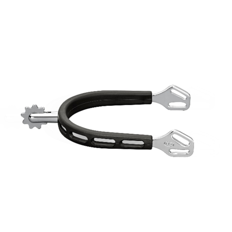 Ultra fit GRIP sporen met Balkenhol systeem en rubber rond de spoor voor extra bescherming voor de laars. Groot grofgetand wiel, 25mm. Het Balkenhol systeem geeft een unieke pasvorm en design. De sporenbandjes worden in een hoek van 45 graden door de spoor