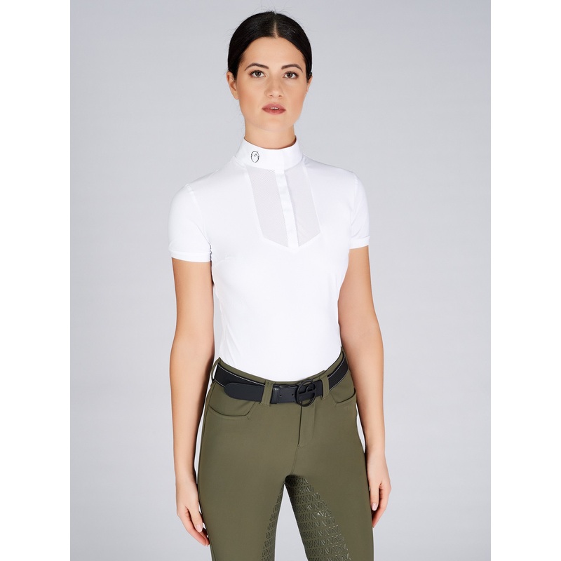 Vestrum Porto Venere Women’s Short Sleeve Show Shirt – a classic and gorgeous ladies’ competition shirt made from breathable, stretchy and lightweight material. There’s a Vestrum logo embroidered on the standing collar and a glossy logo printed on the sleeve. The mesh bib on the front gives it a feminine look. The hidden snap button closure on the front offers an easy and comfortable fit.