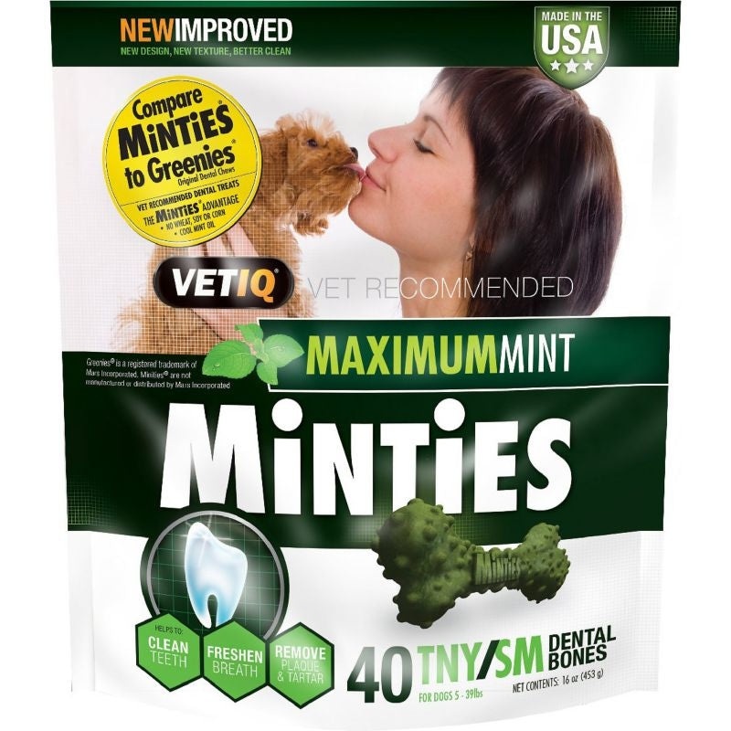 VetIQ Minties Tiny/Small Dog Dental Treats There is nothing sweeter than an affectionate kiss from your favorite pooch. But unfortunately, bad dog breath can often ruin what should be a sweet and enduring moment. Minties from VetIQ is here to help! They ar