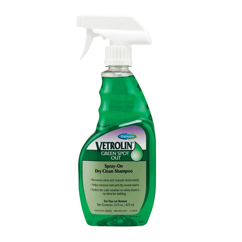 Banish manure and urine stains without bathing your horse using Vetrolin Green Spot Out. This spray-on, dry clean shampoo is perfect for cold weather or when there's no time for bathing.-Removes urine and manure stains easily-Helps remove wet and dry sweat