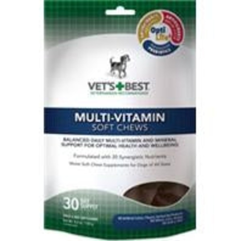 Moist soft chews for dogs of all sizes and breeds. Formulated with 20 synergistic nutrients. Veterinarian-formulated to proactively promote your dogs physical and mental wellbeing. Each daily chew is loaded with essential vitamins, minerals and nutrients that may be missing from your pets diet. Densely packed with active ingredients and a high level of bioavailability for optimal absorption. Made from ocean kelp for stress relief, antioxidants for immune system care, and prebiotics to promote digestion.