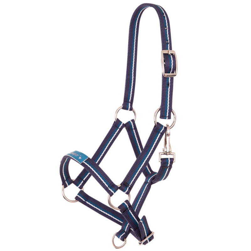 Driekleurig veulenhalster met smalle banden van gestreept polypropyleen. Zowel het kopstuk als de neusriem zijn verstelbaar met een gespsluiting. De neusriem is afgewerkt met een label met fun text. De keelriem is voorzien van een karabijnhaak. Het halster