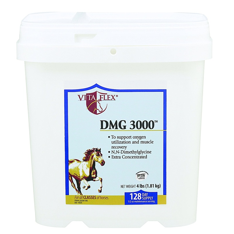 Extra concentrated to deliver a minimum of 3000 mg. DMG per ounce. Dimethylglycine, a naturally occurring nutrient,is known as an intermediary metabolite due to its crucial role in oxygen transport and methyl donation. Feed 1/4 oz. twice daily. then 1/2 oz. to 3/4 oz. twice daily beginning 2 to 3 days before and during performance. (2,250 mg/serving).