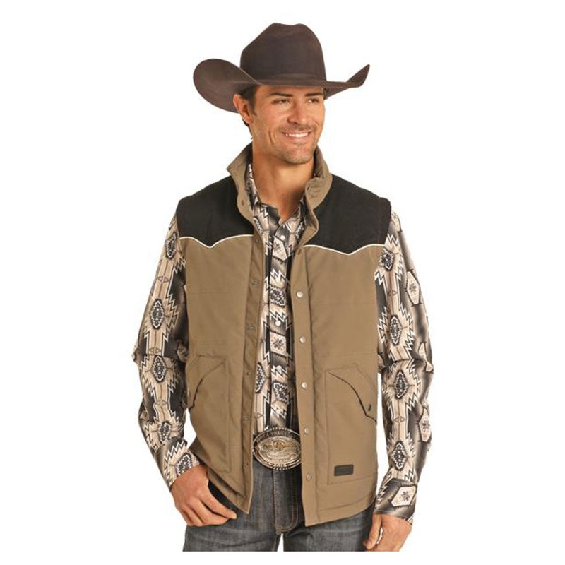 Panhandle Men's Vintage Vest in Black & Khaki BrownRegular fit Snap closureWestern Piped YokeBlack Corduroy YokeSide PocketsSmall inside zip pocket60% cotton / 40% nylonBlack & Khaki Brown
