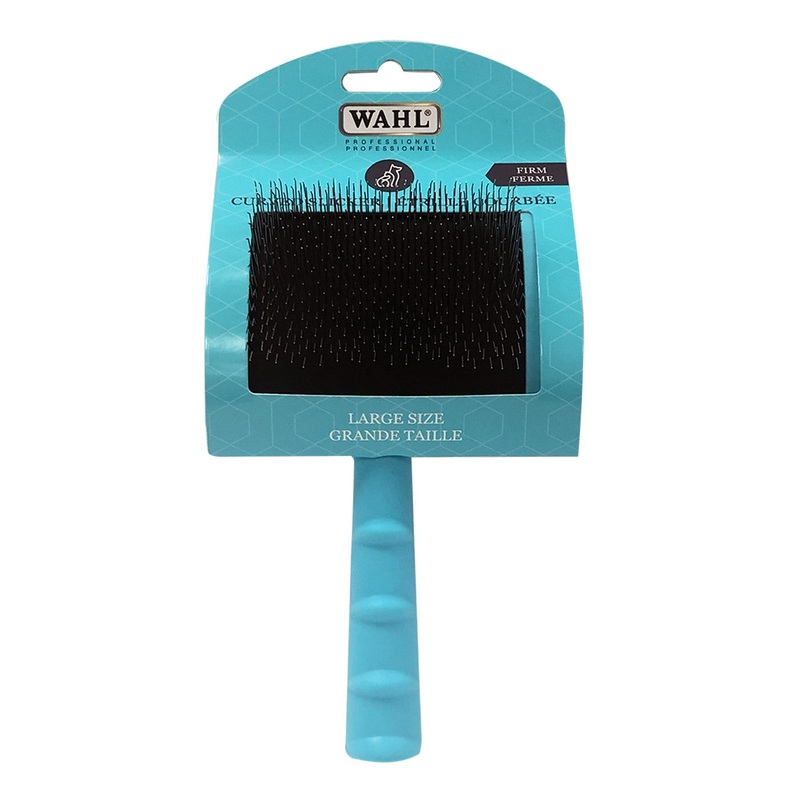 The Wahl Curved Slicker Brush offers an extra long construction, with firm yet flexible stainless steel pins to penetrate deeper into thick coats. The increased head curvature allows for added control and movement for optimal comfort. The angled pins lift the topcoat to grip and remove more hair, and the non-slip surface is lightweight to reduce wrist fatigue.
