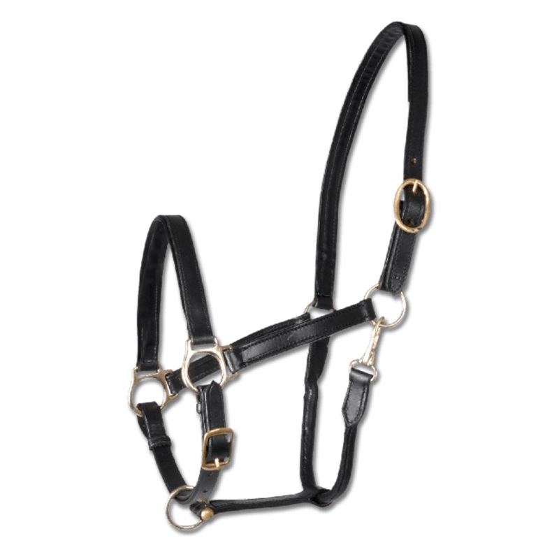 Hard wearing leather halter featuring a padded nose- and poll strap. Brass coated fittings and multi adjustable at the poll- and curb strap.